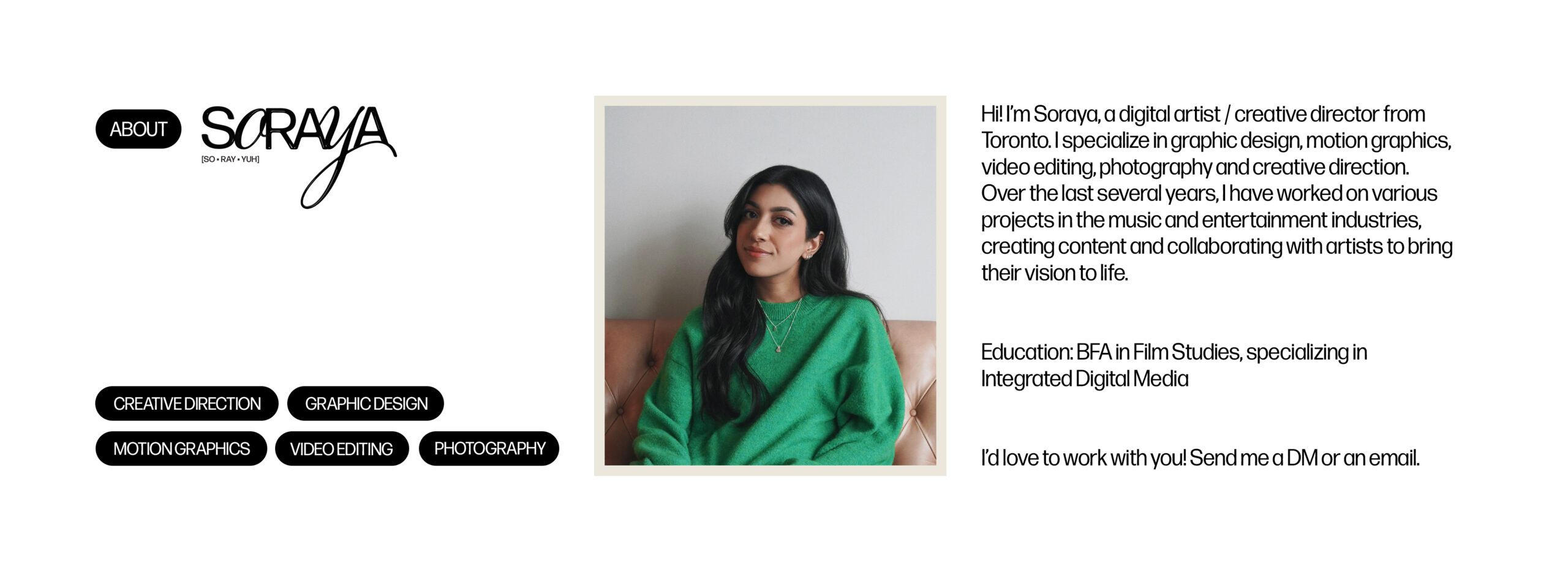 Hi! I’m Soraya, a digital artist / creative director from Toronto. I specialize in graphic design, motion graphics, video editing, photography and creative direction. Over the last several years, I have worked on various projects in the music and entertainment industries, creating content and collaborating with artists to bring their vision to life.